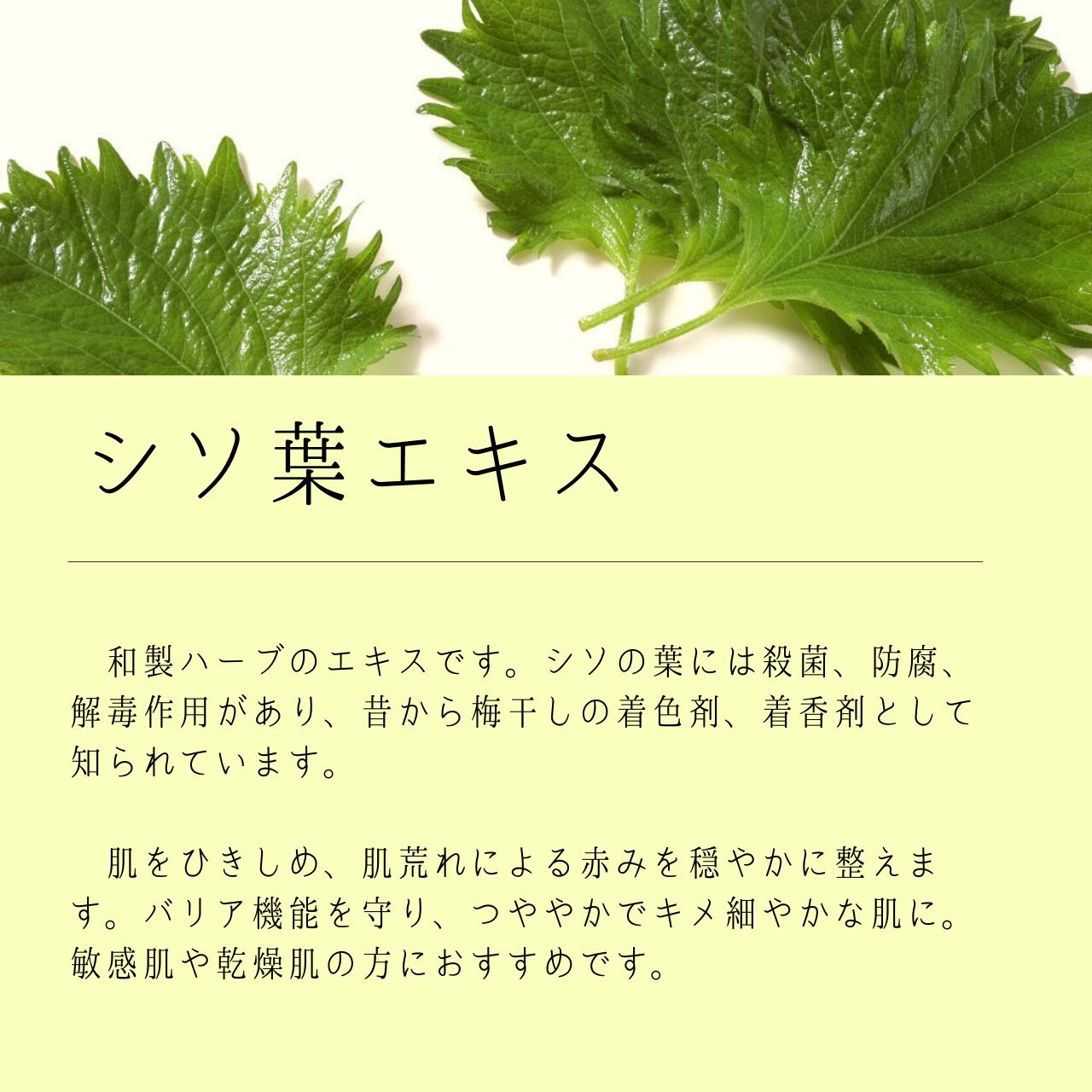 全成分:水、BG、ヒアルロン酸Na、アロエベラ葉エキス、アルニカ花エキス、キュウリ果実エキス、セイヨウキズタエキス、セイヨウニワトコエキス、ゼニアオイエキス、パリエタリアエキス、シソエキス、PEG-20ソルビタンココエート、メチルパラベン、花粉エキス