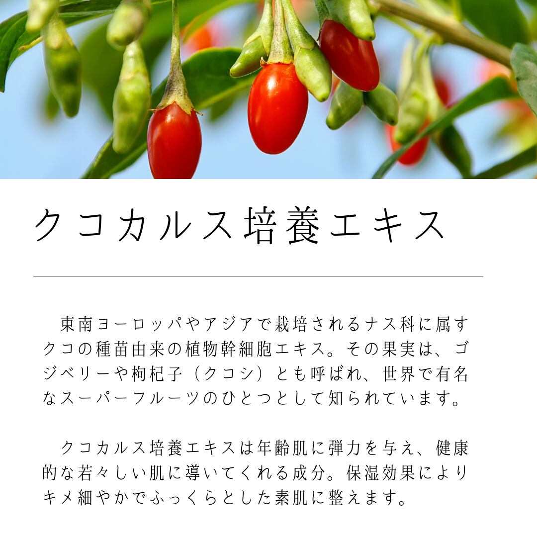 全成分:水、BG、ソルビトール、ジグリセリン、ラフィノース、乳糖、カルボマー、マンニトール、結晶セルロース、ヒドロキシエチルセルロース、水酸化K、PEG-80水添ヒマシ油、フェノキシエタノール、メチルパラベン、フィチン酸、オキシベンゾン-5、グリチルリチン酸2K、トコフェロール、パルミチン酸アスコルビル、酢酸トコフェロール、ヒドロキシプロピルメチルセルロース、イソマルト、ユビキノン、酸化鉄、アルテミアエキス、ヒアルロン酸Na、クコカルス培養エキス、レシチン